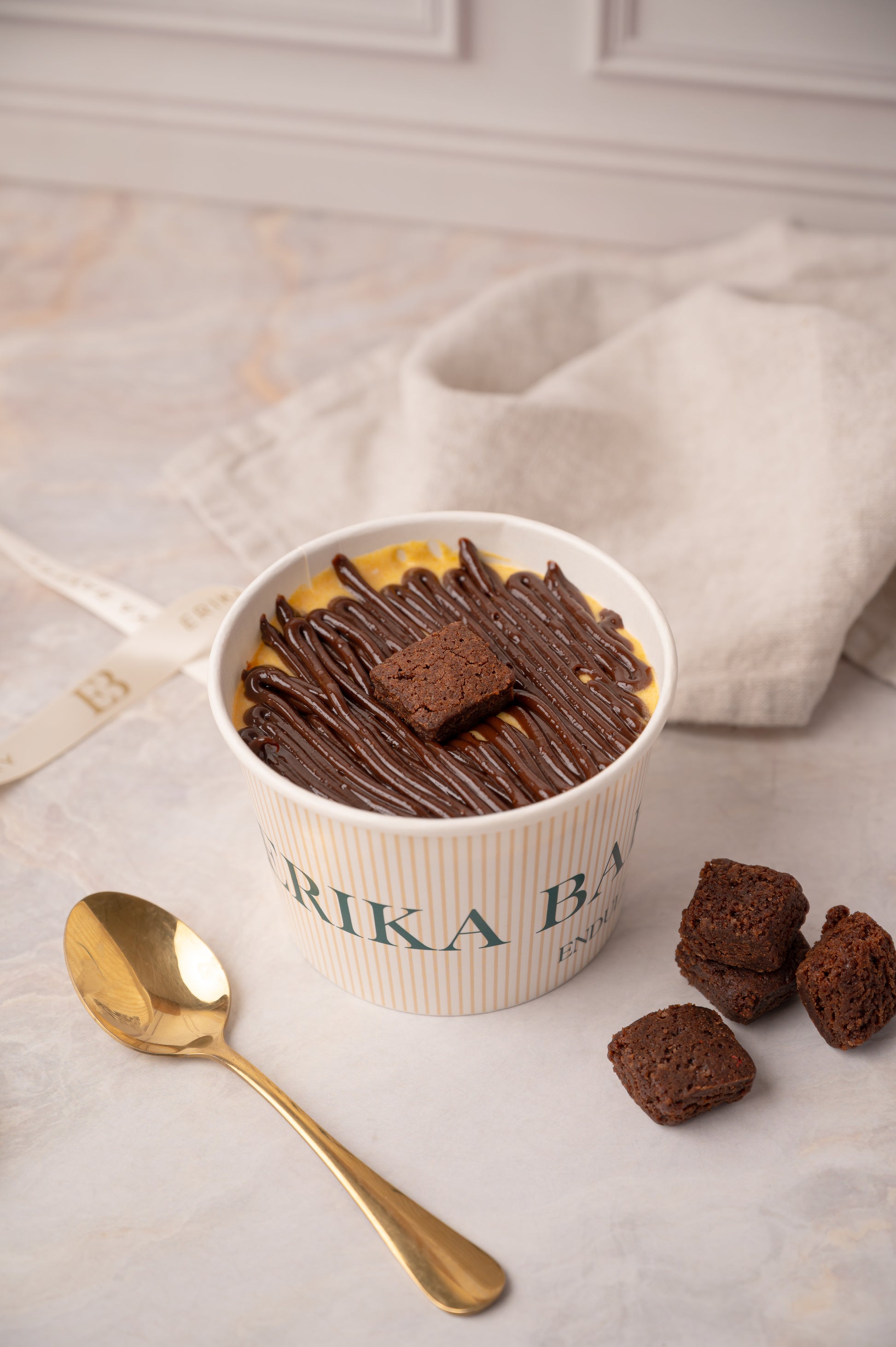 Pedacitos de brownie con mouse de lúcuma y fudge de olla, porción personal