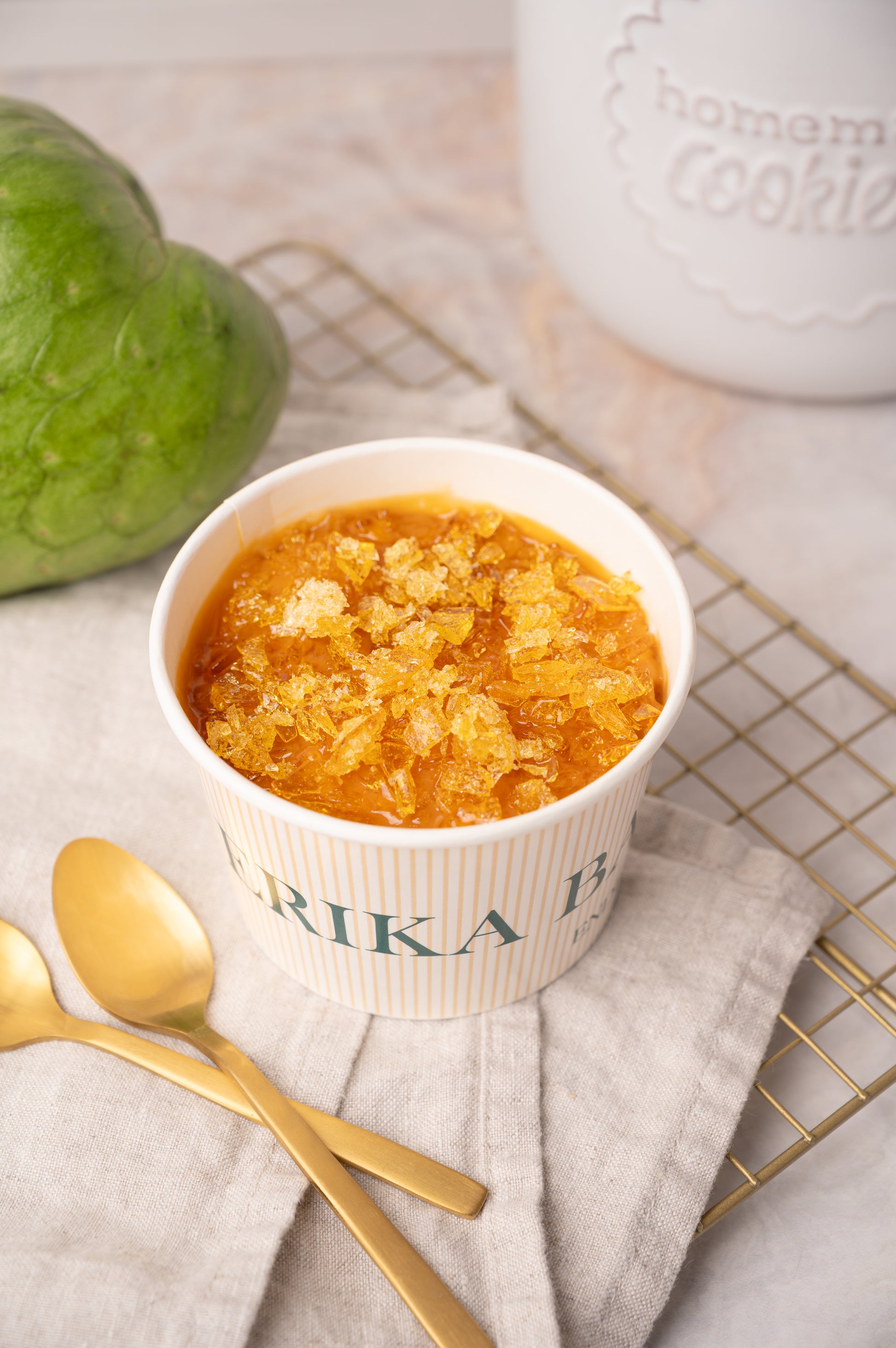 Bizcocho de vainilla relleno de manjar de olla, chantilly con trozos de chirimoya cubierto en caramelo picadito.