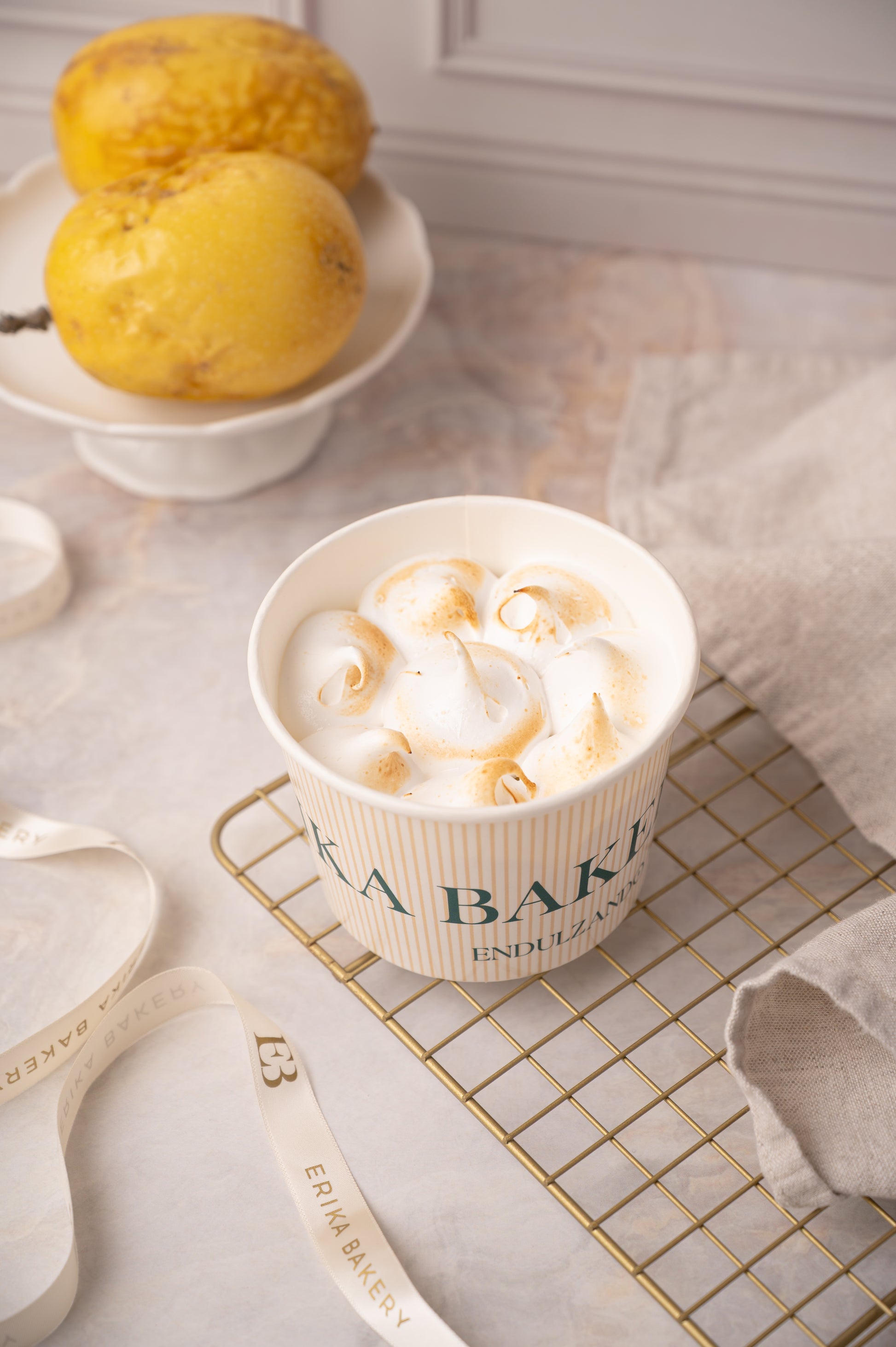 Base con galletas de vainilla, crema de maracuyá y merengue, porción personal.