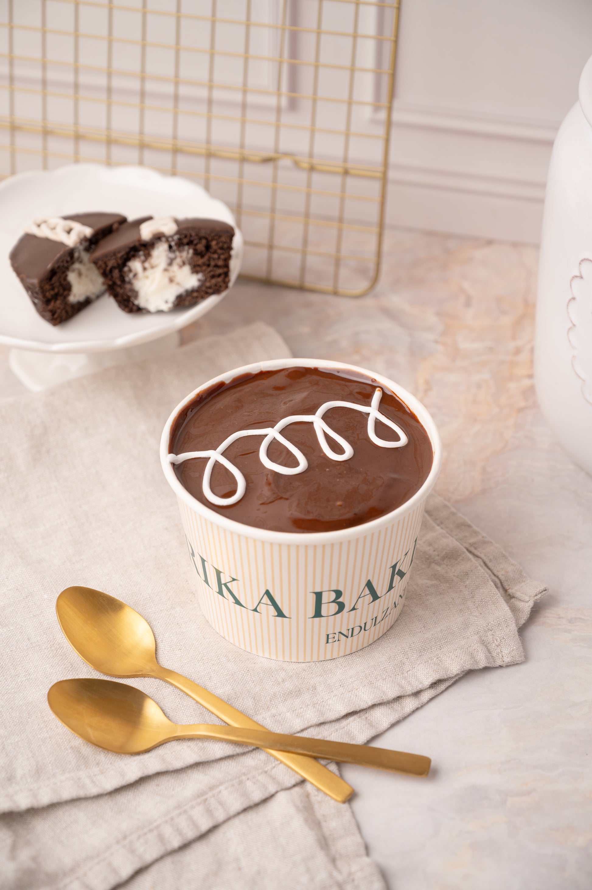 Capas de cake de chocolate relleno al medio con merengue italiano y cubierto en fudge.