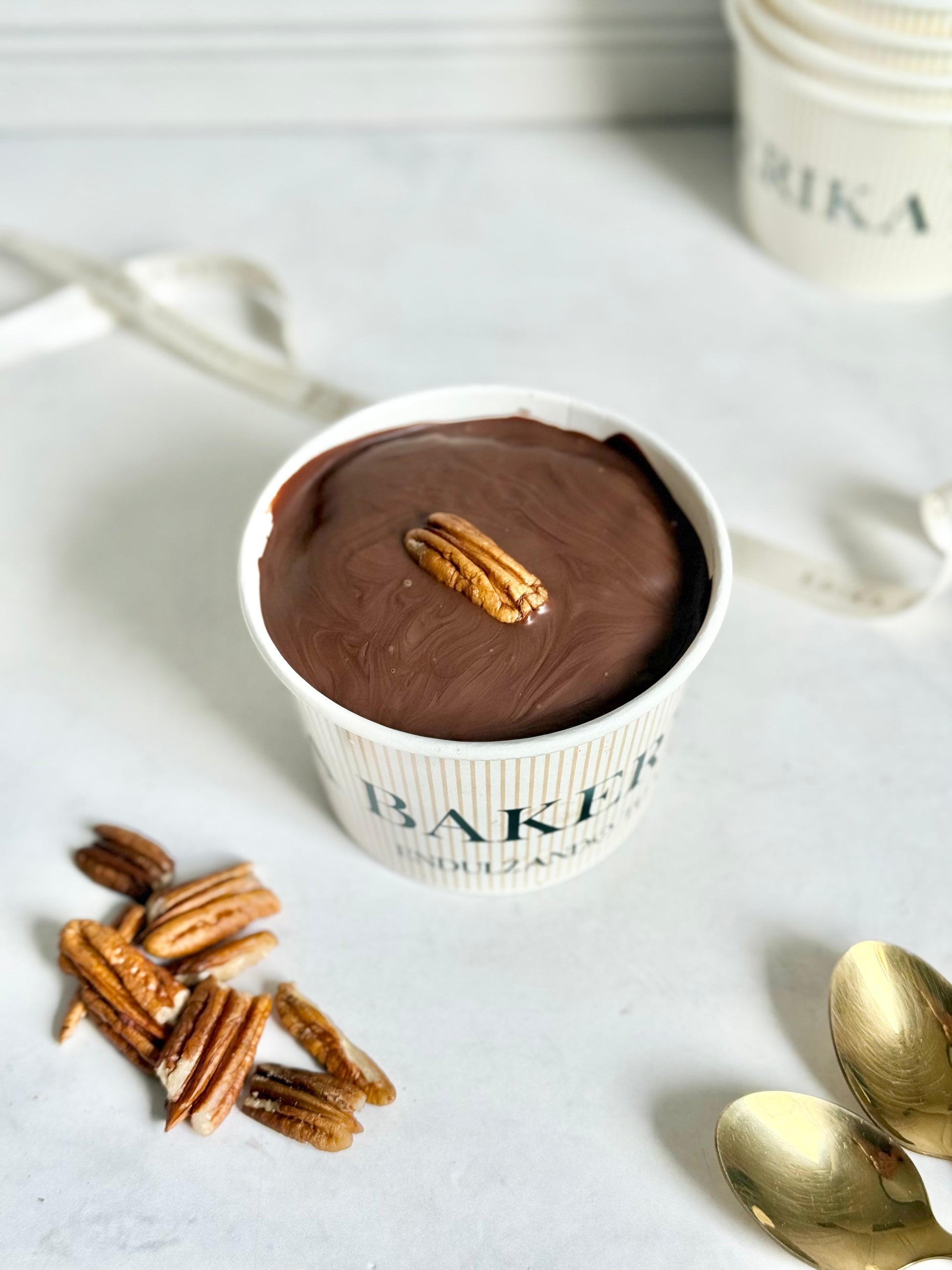 Capas de torta de chocolate rellenas de manjar de olla con trozitos de pecanas y con cobertura semiamarga encima