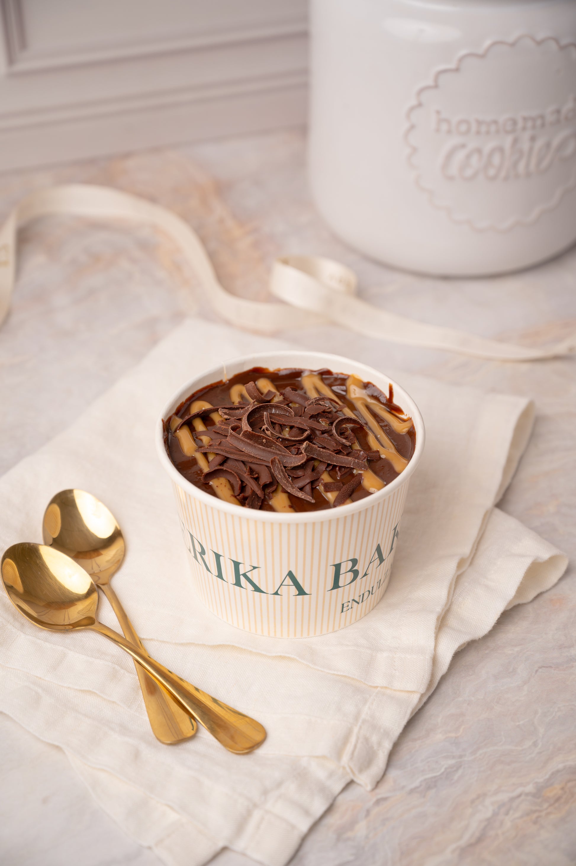Capas de torta húmeda de chocolate relleno de fudge y manjar de olla, porción personal